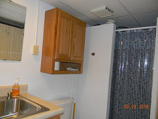 Those of you who know…know that our basement bathroom was in need of some TLC. A major pipe leak proved to be the agent of change. The old floor and cabinet were torn out to do repair and never to return! These are some pictures of what we ended up with.